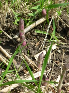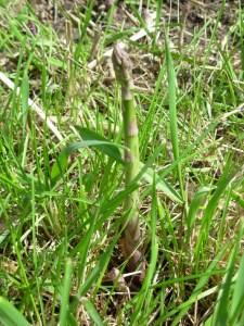 The first edible sign of spring has arrived – asparagus. I discovered the first lonely stalk standing proud, about 8 inches tall, yesterday. Nearby were a few shorter stubs. There wasn’t quite enough for a meal, so the little clump is still standing.