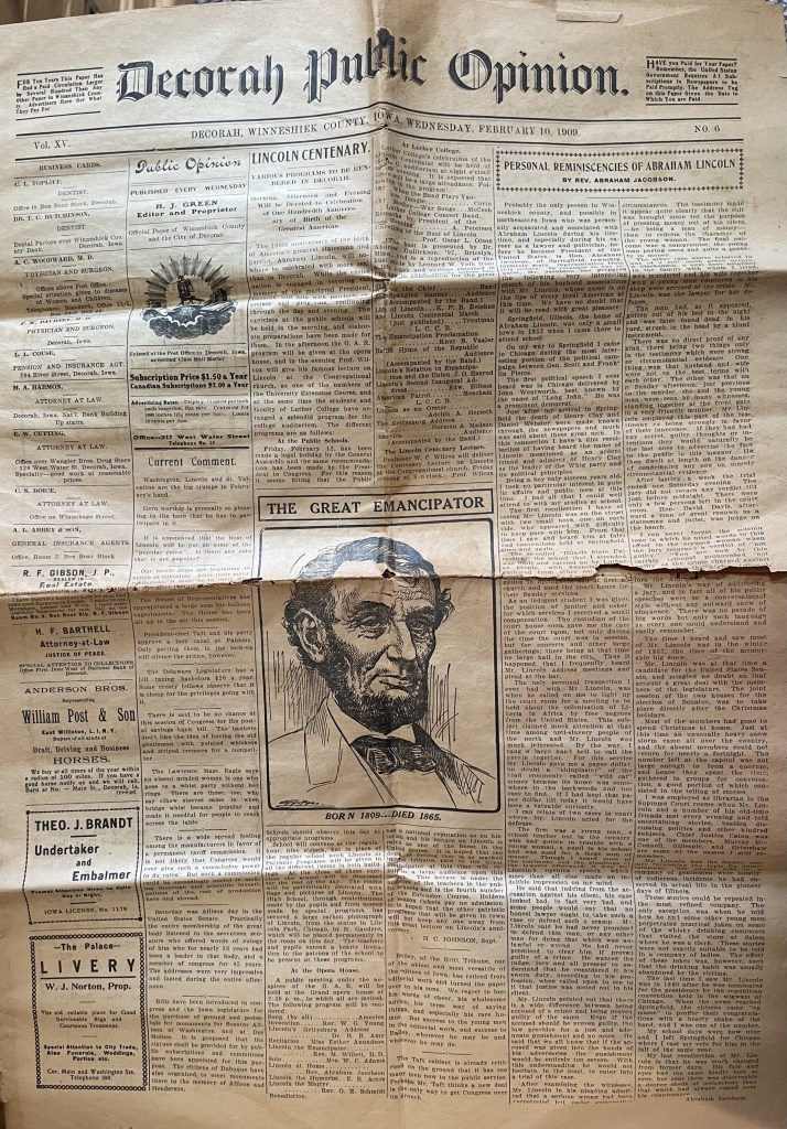 Last summer Mim spent many days systematically going through boxes and boxes filled with old papers, photos, and books that had belonged to her parents and grandparents. One yellowed newspaper, carefully protected in a waxed paper-like envelope was the Decorah Public Opinion from Decorah, Iowa, dated Wednesday, February 10, 1909. That is the year Abraham Lincoln would have turned 100 years old. The country was ready to celebrate the life of the greatest American who had ever lived. The big story that spanned two full columns on the front page was, “Personal Reminiscences of Abraham Lincoln” by Rev. Abraham Jacobson. That was Mim’s grandfather. He had actually known Abraham Lincoln.